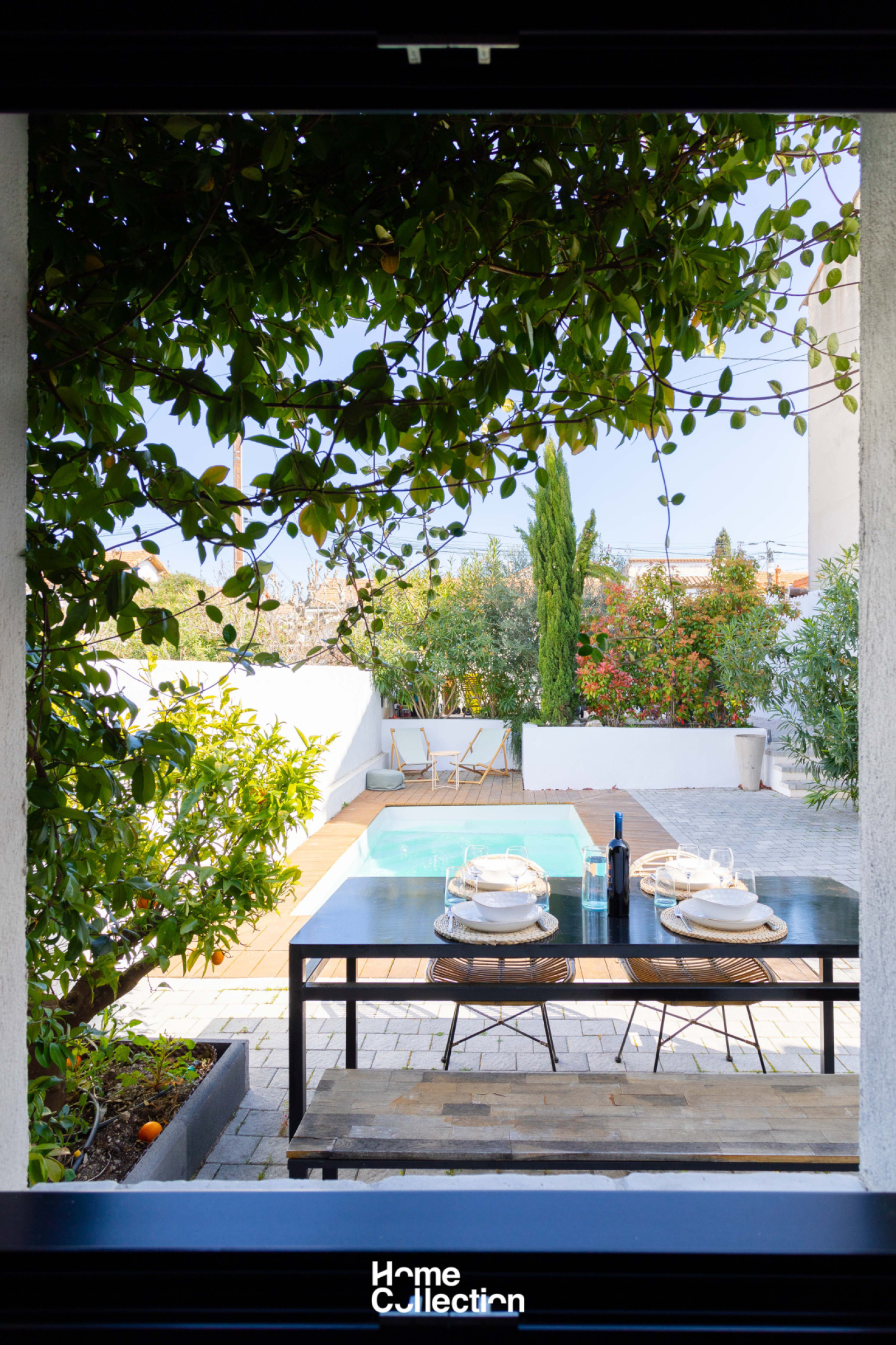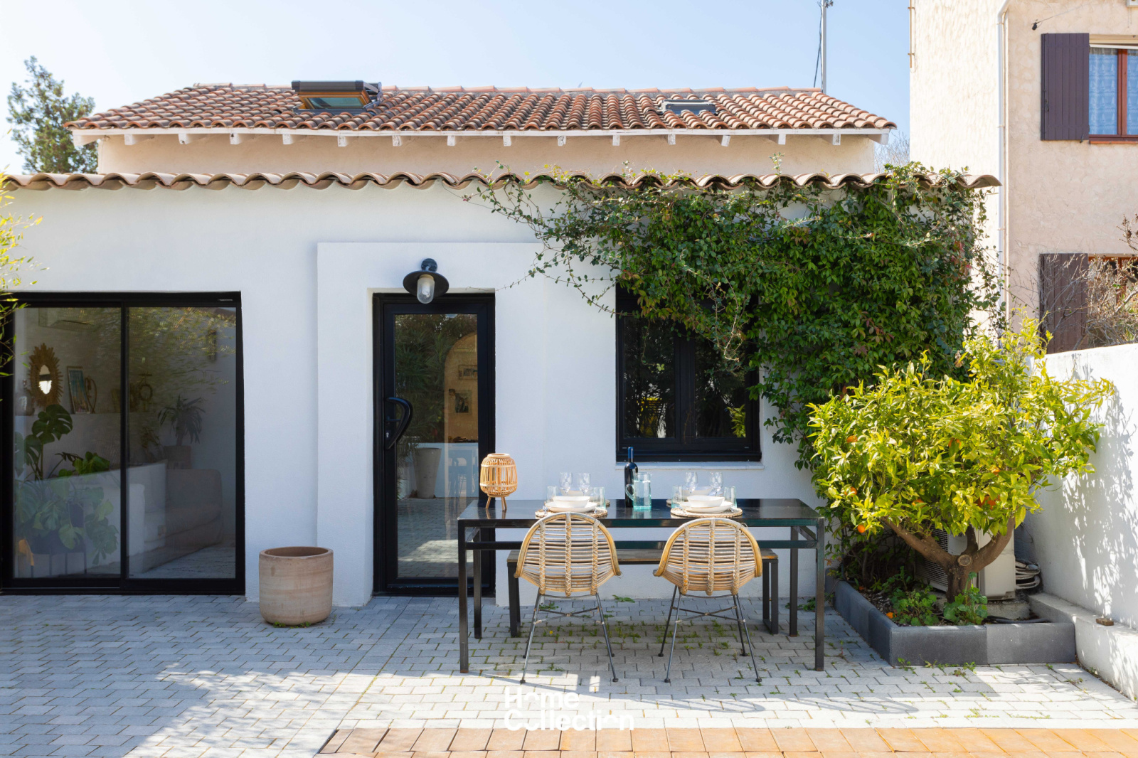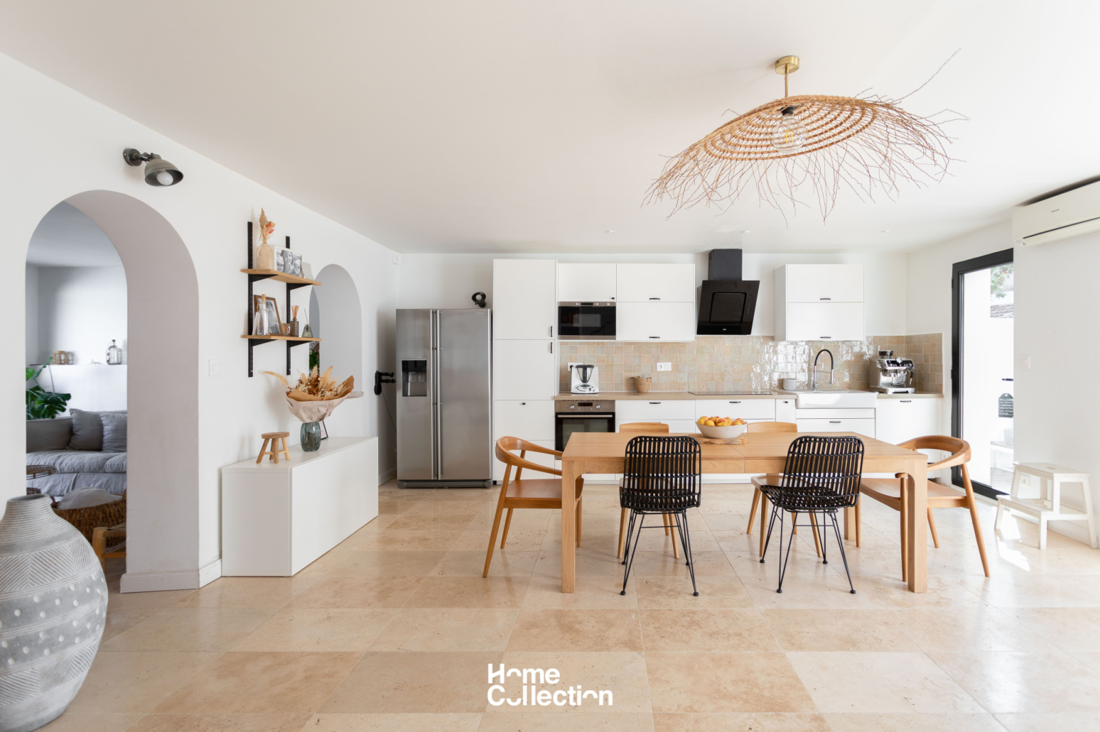 L'entrée s'ouvre sur une piscine face à une jolie façade au cachet conservé. La lieu de vie aéré et ouvert par des arches se prolonge sur une terrasse en teck, ensoleillé toute l'année. Déco bohème et matériaux nobles sont sublimés par la luminosité constante des baies vitrées.