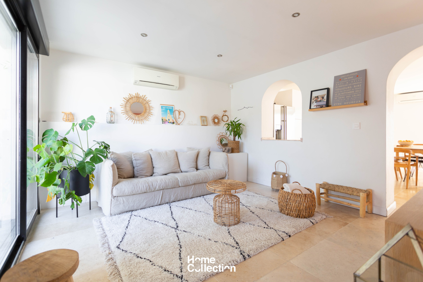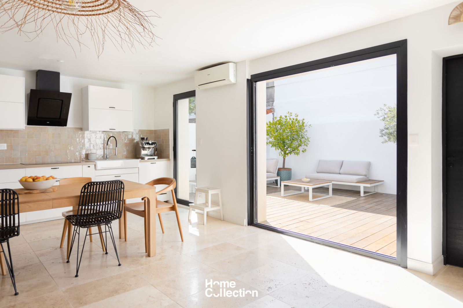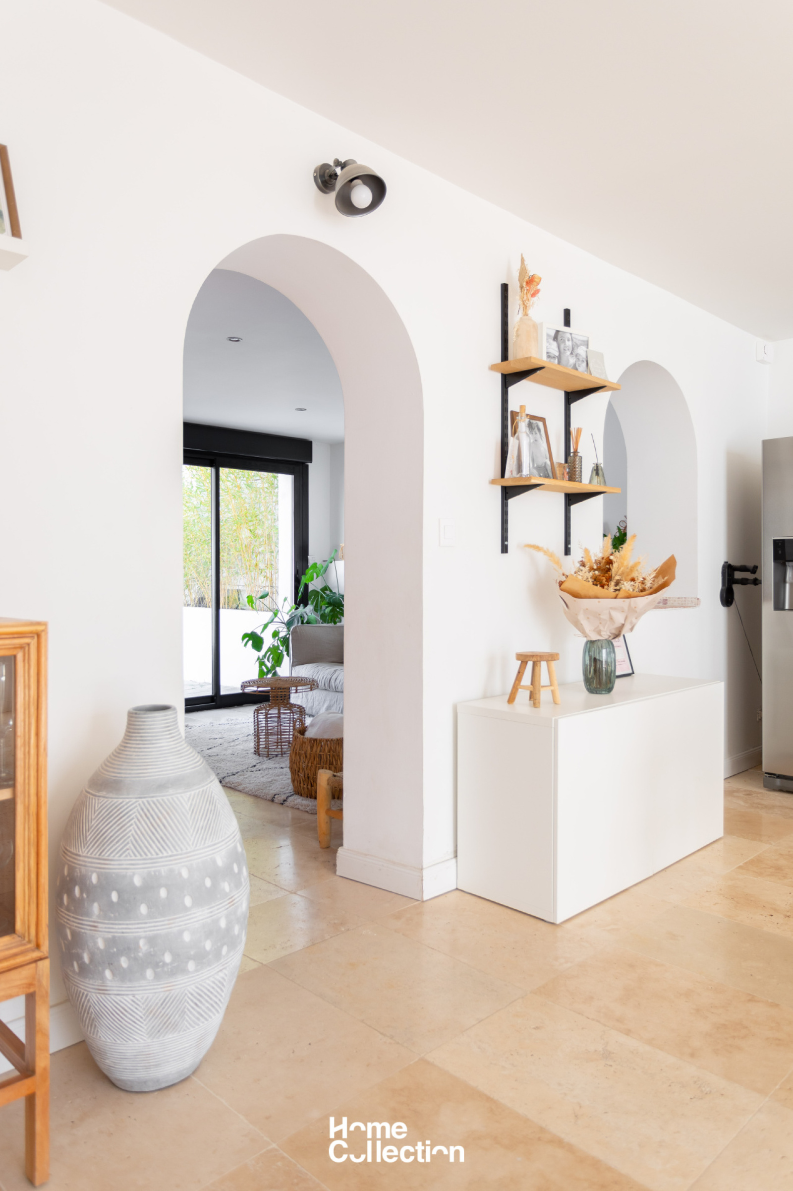 L'entrée s'ouvre sur une piscine face à une jolie façade au cachet conservé. La lieu de vie aéré et ouvert par des arches se prolonge sur une terrasse en teck, ensoleillé toute l'année. Déco bohème et matériaux nobles sont sublimés par la luminosité constante des baies vitrées.