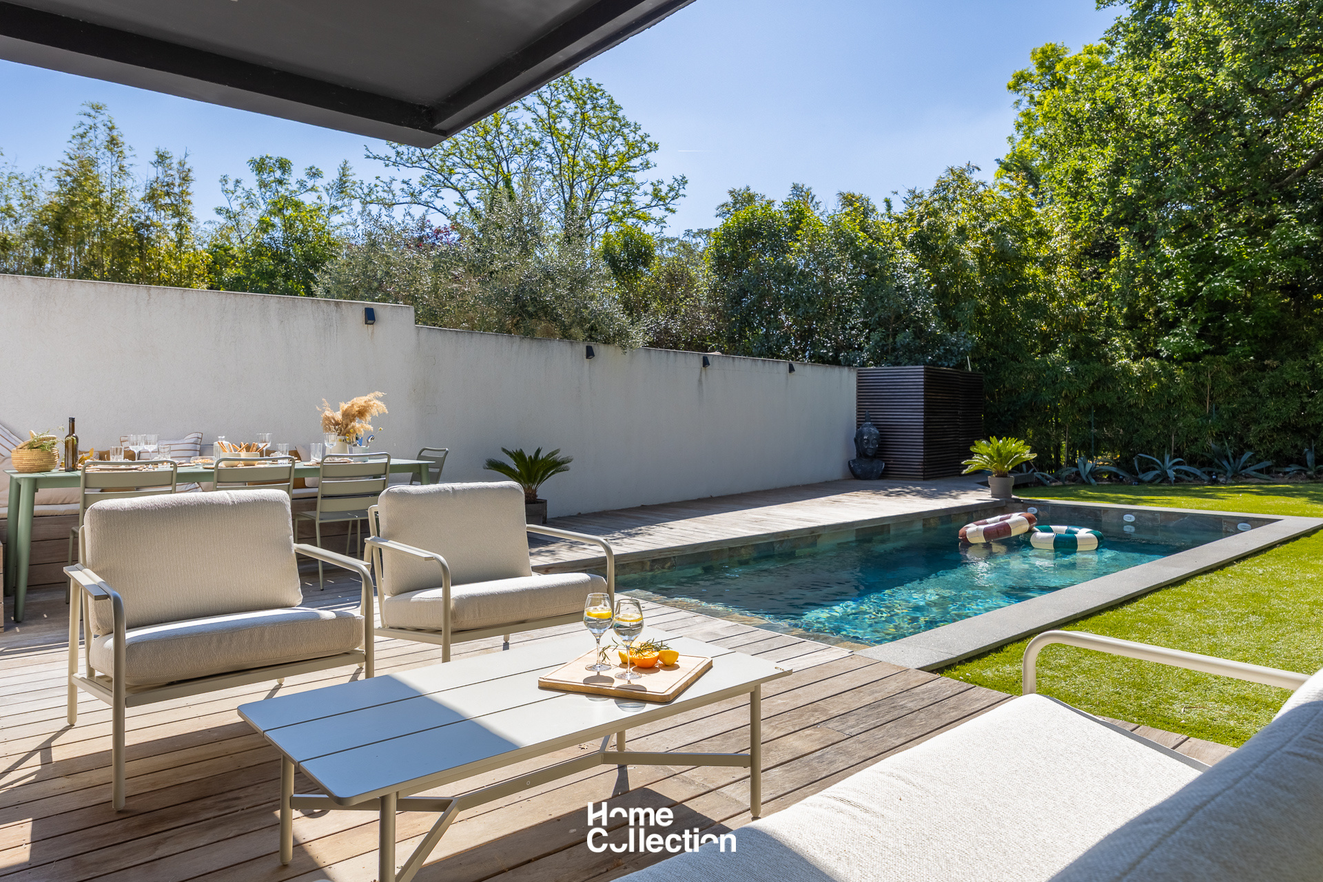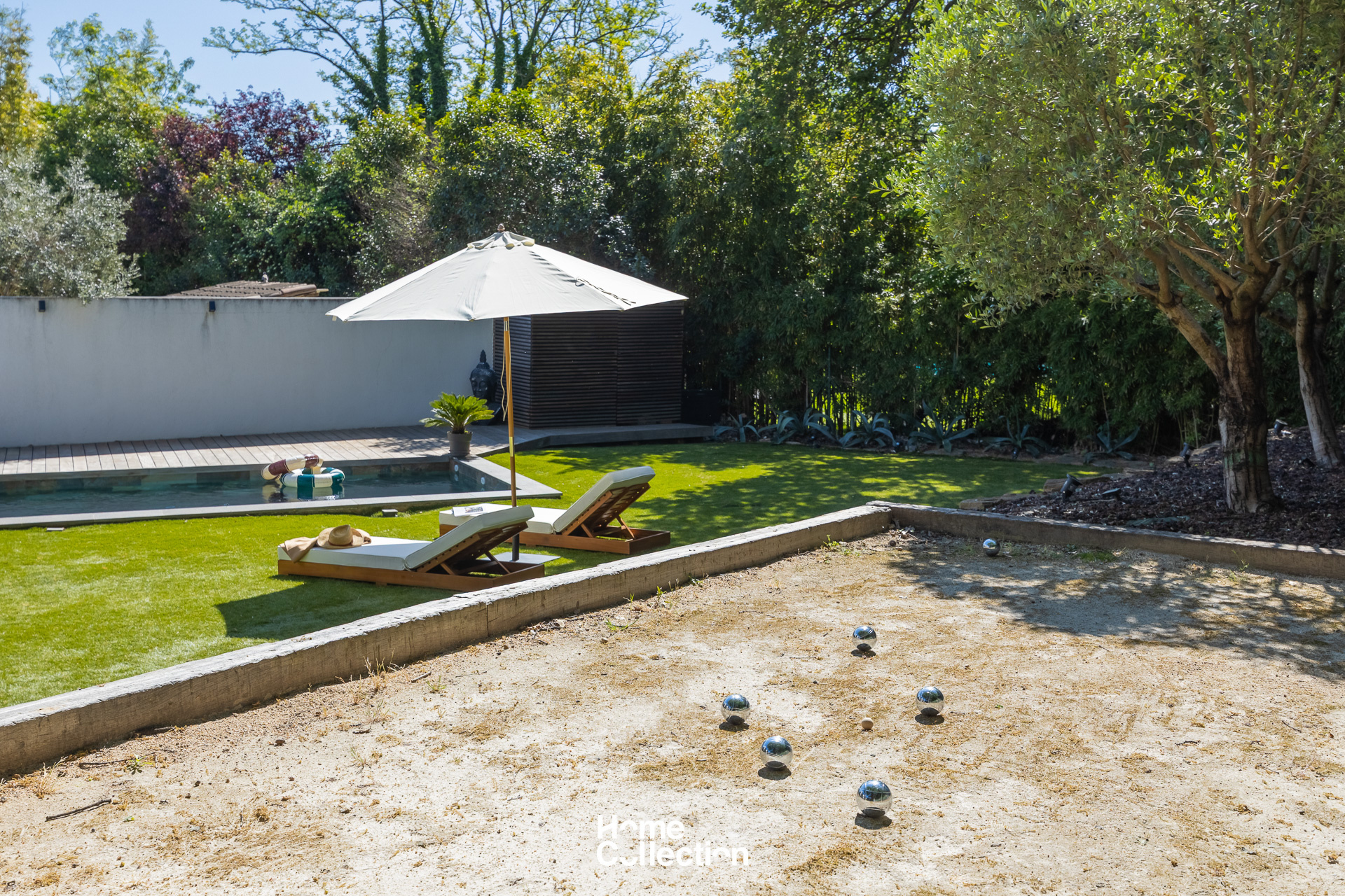 À l’extérieur, vous profiterez d’un beau jardin paysager avec piscine, d’un terrain de pétanque ainsi que d’une agréable terrasse en ipé, idéale pour les moments de détente en famille ou entre amis.