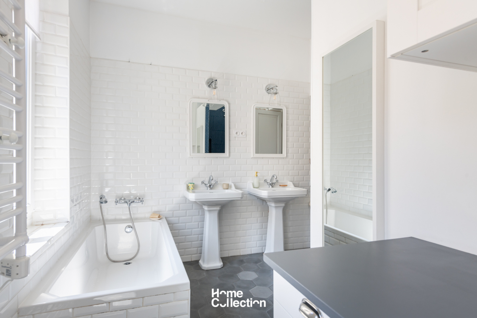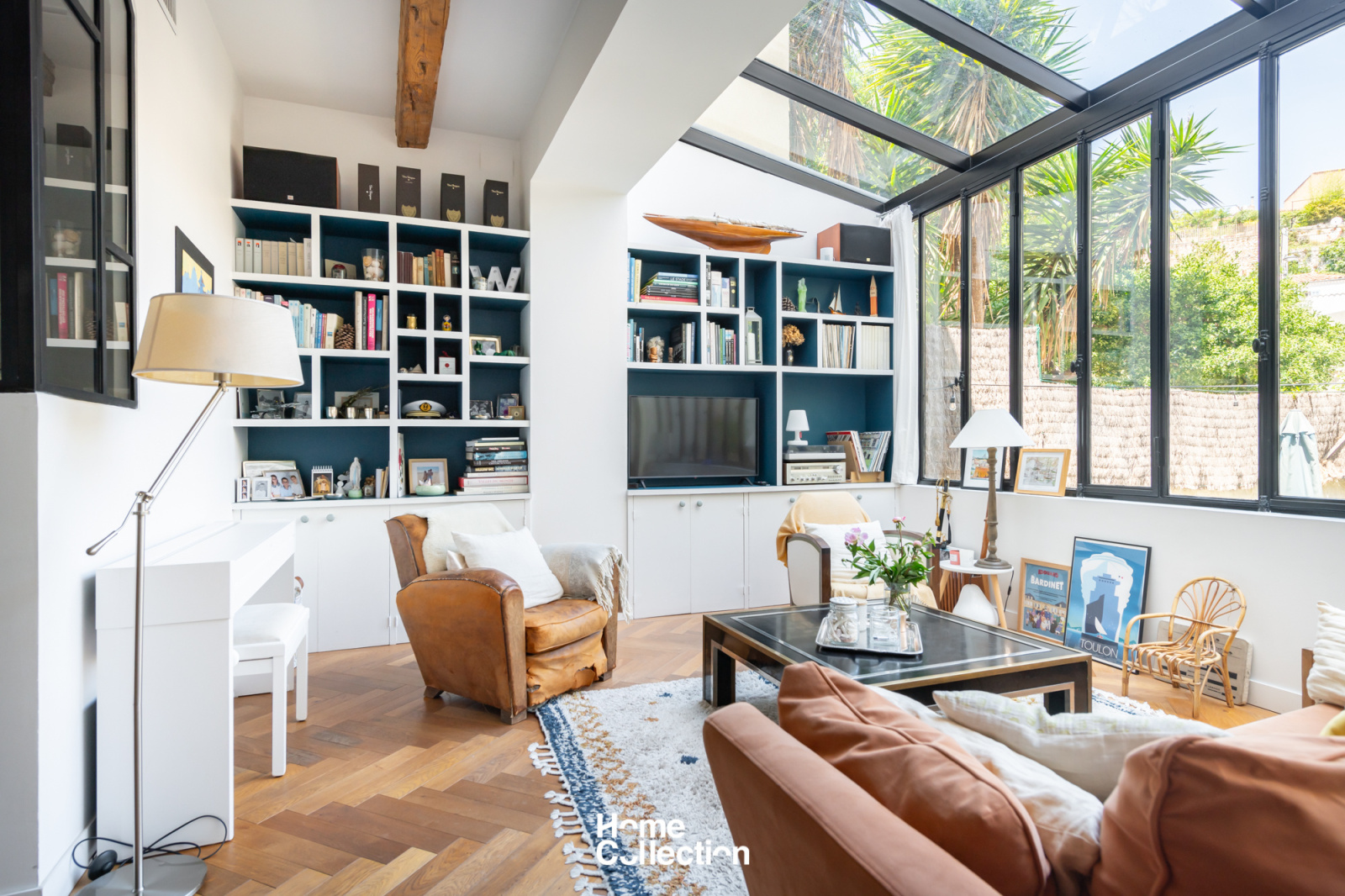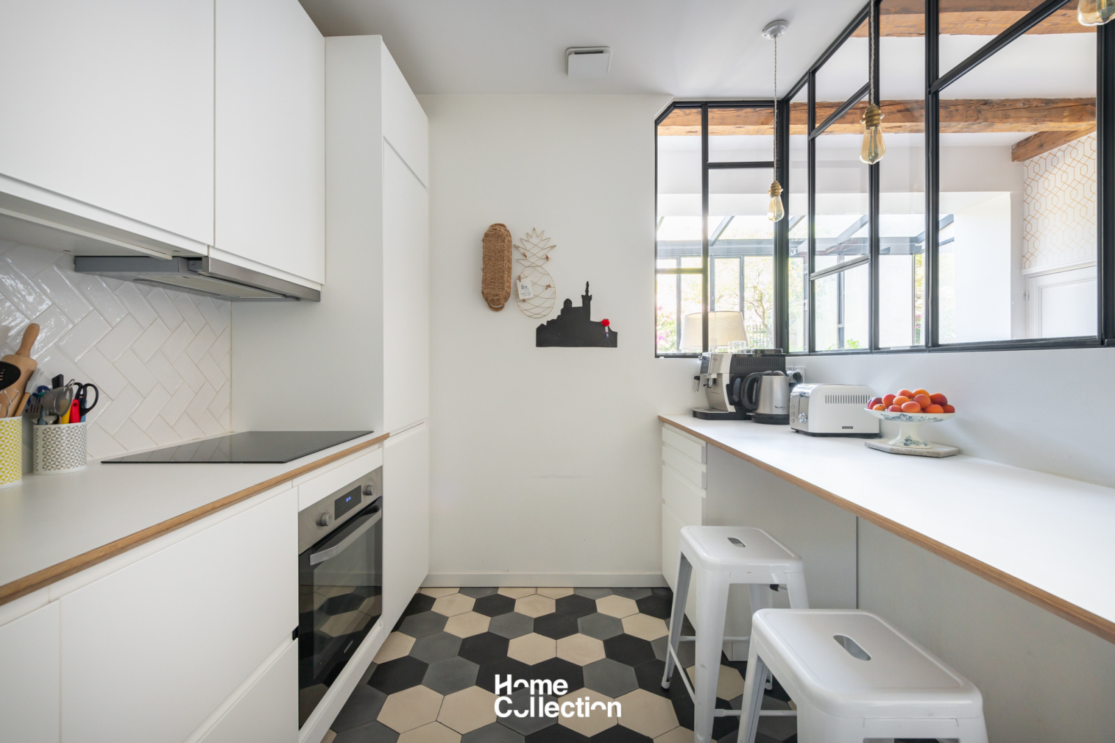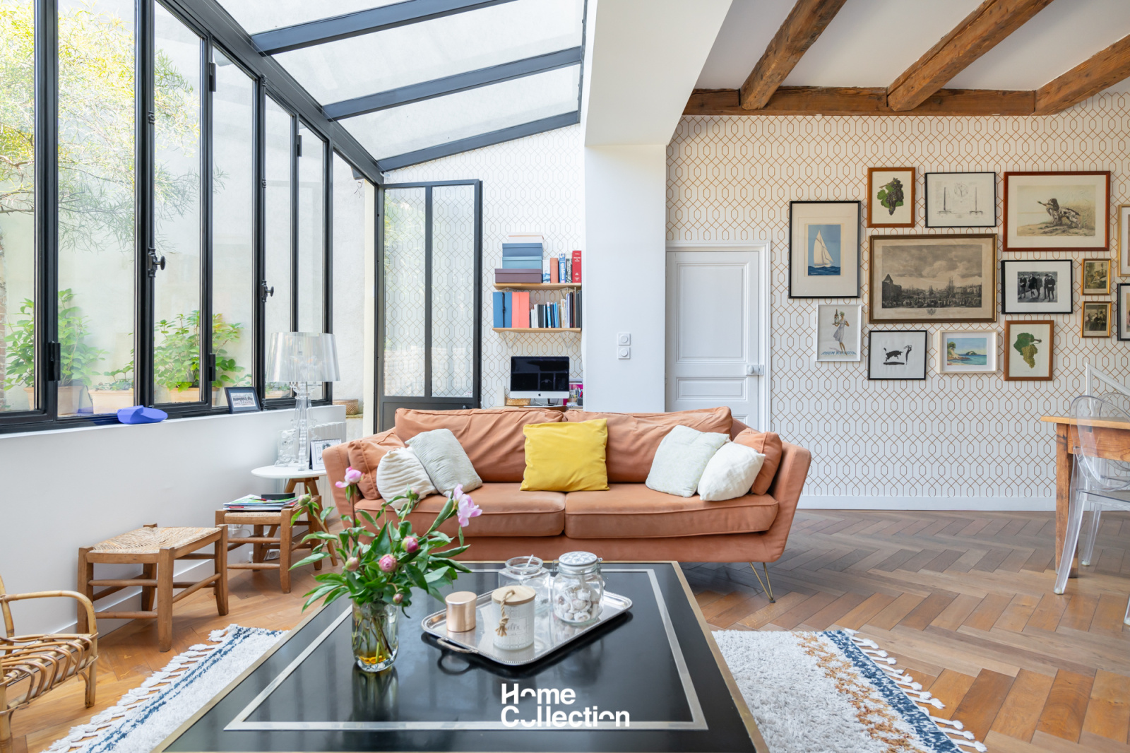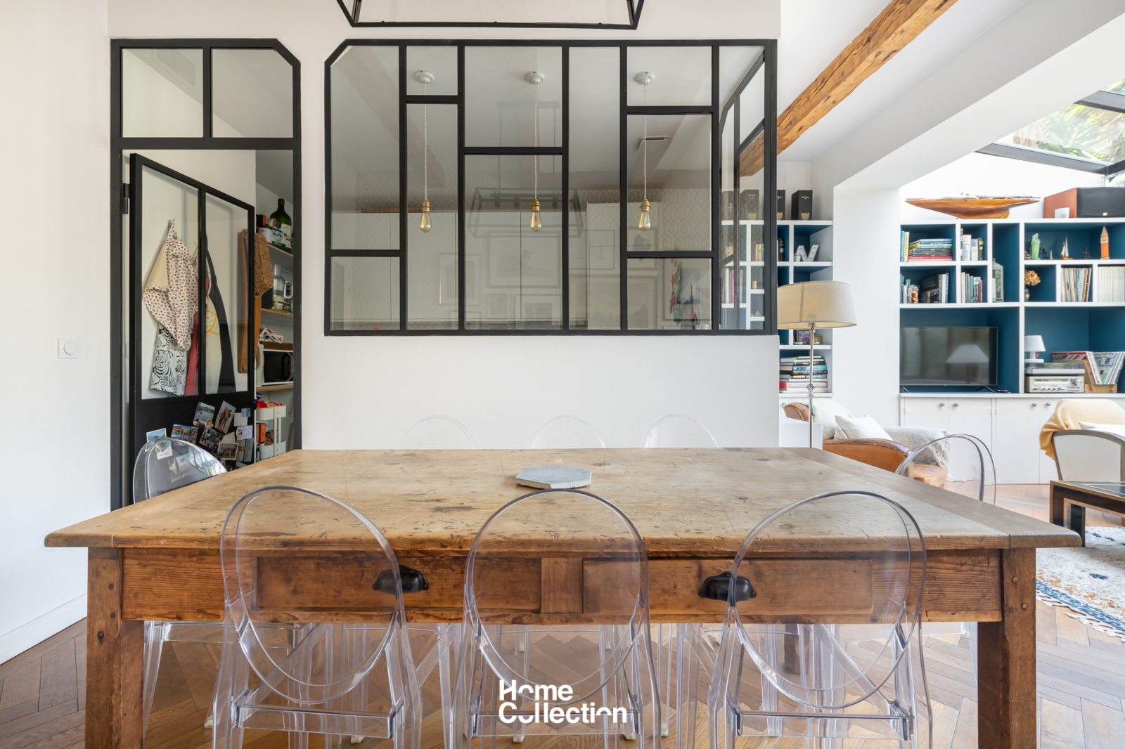 Dès l'entrée, on est accueilli par un espace de vie lumineux et spacieux. Au rez-de-chaussée, vous y trouverez le séjour/cuisine, prolongé par une magnifique verrière d'atelier, qui ajoute une touche d'élégance industrielle et permet une transition harmonieuse entre l'intérieur et l'extérieur. La verrière s'ouvre sur un jardin d’environ 40m2 au calme absolu.