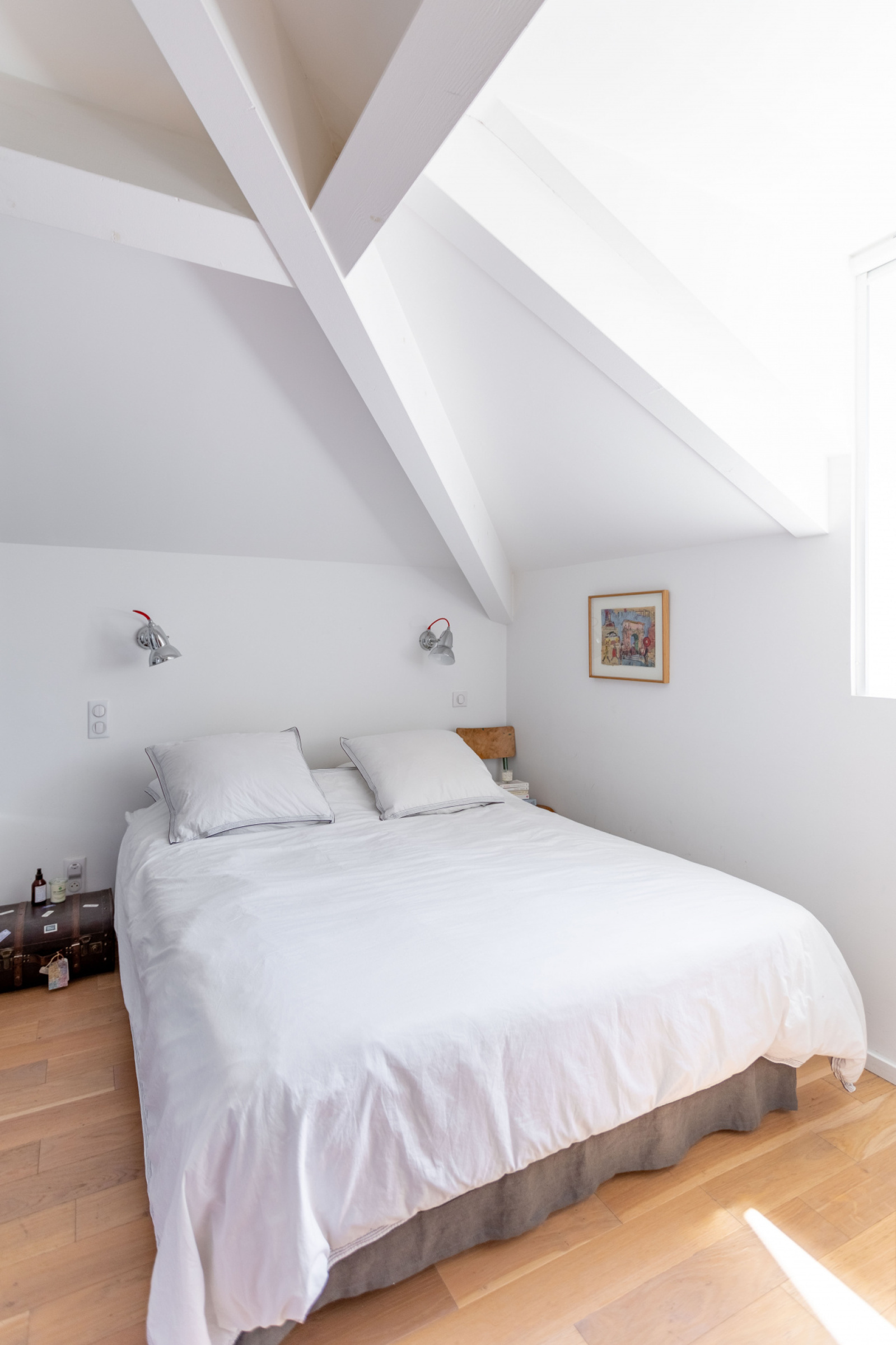 Cet espace offre 3 chambres dont deux avec leurs salles de bains et placards intégrés. L’ensemble est sublimé par la présence d’une charpente d’époque blanchie aux fins de lui apporter un côté contemporain attendu pour redonner vie à ces formes uniques.