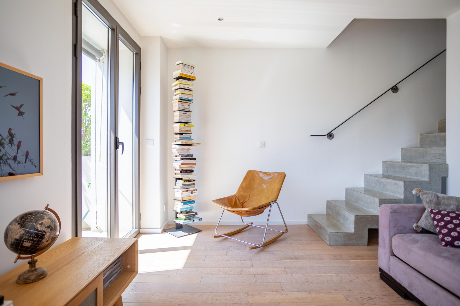 Pour accéder au coin nuit, il vous faudra emprunter une magnifique montée d’escaliers en béton ciré mise en valeur par une paroi vitrée toute hauteur.