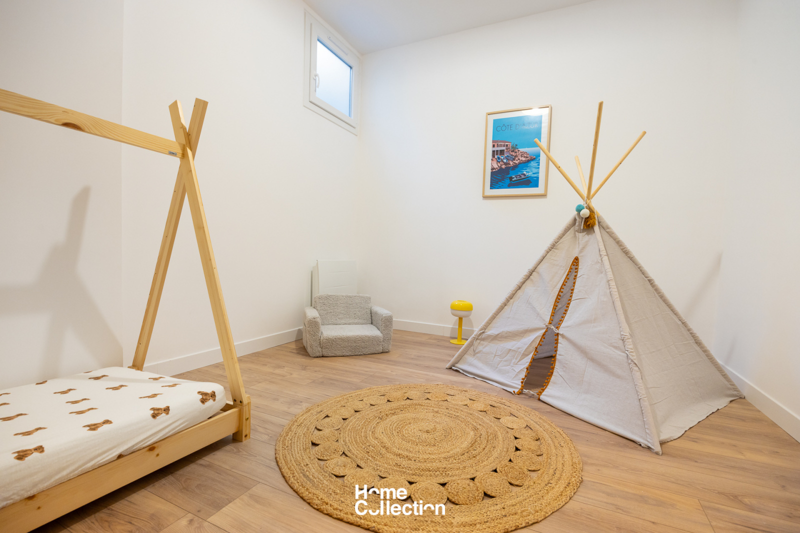 Un escalier en béton ciré mène à l’espace de vie au niveau inférieur, composé d’un vaste salon et d'une cuisine ouverte entièrement équipée, d’une 4ème chambre donnant sur le jardin, d’une salle d’eau et d’un second toilette.