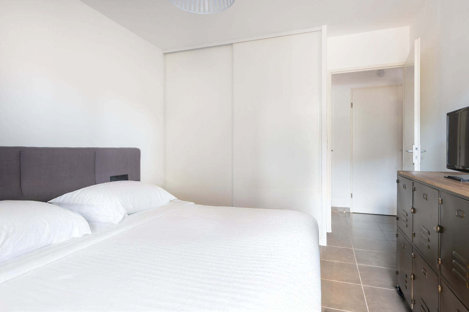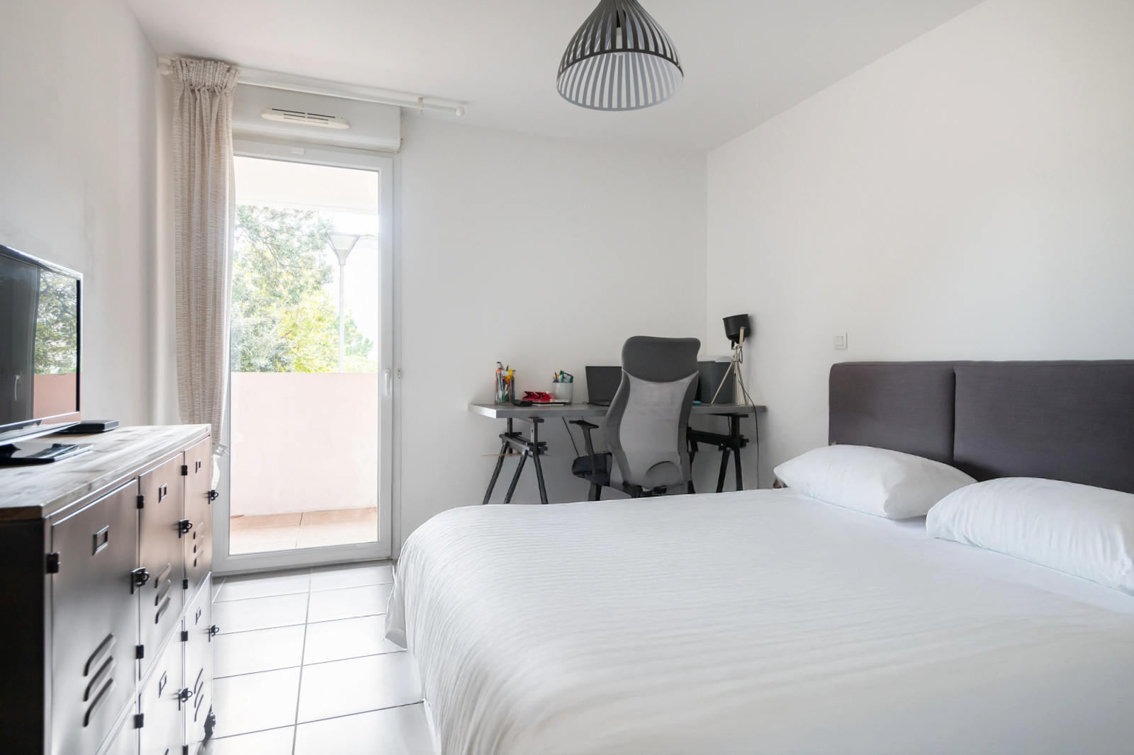 La chambre de 13,5 m², équipée de placards intégrés, donne également sur la terrasse.