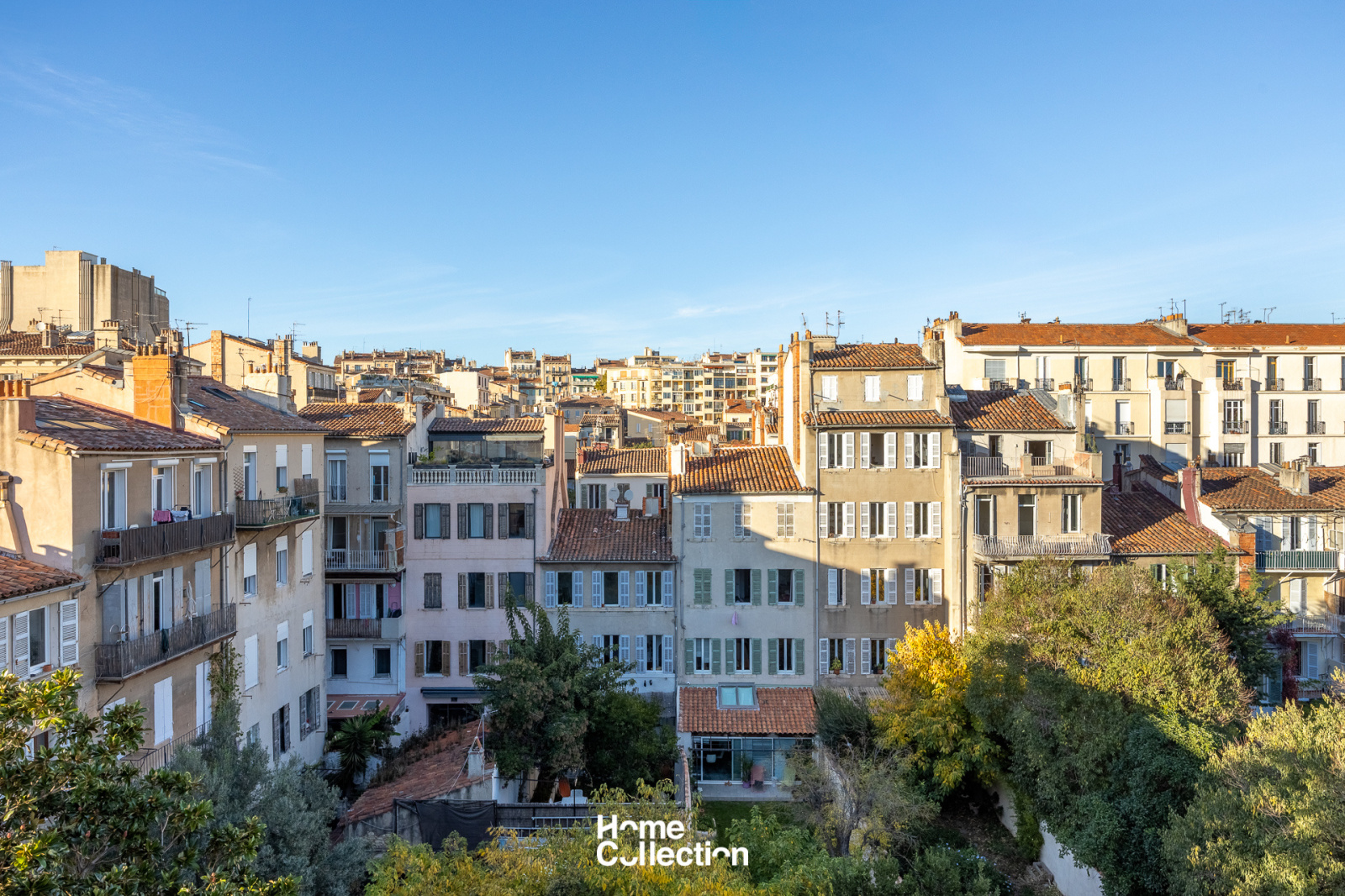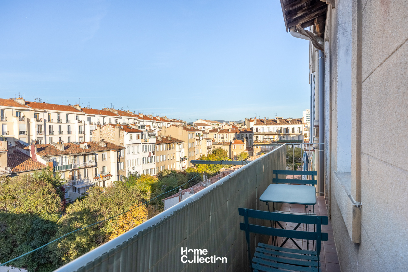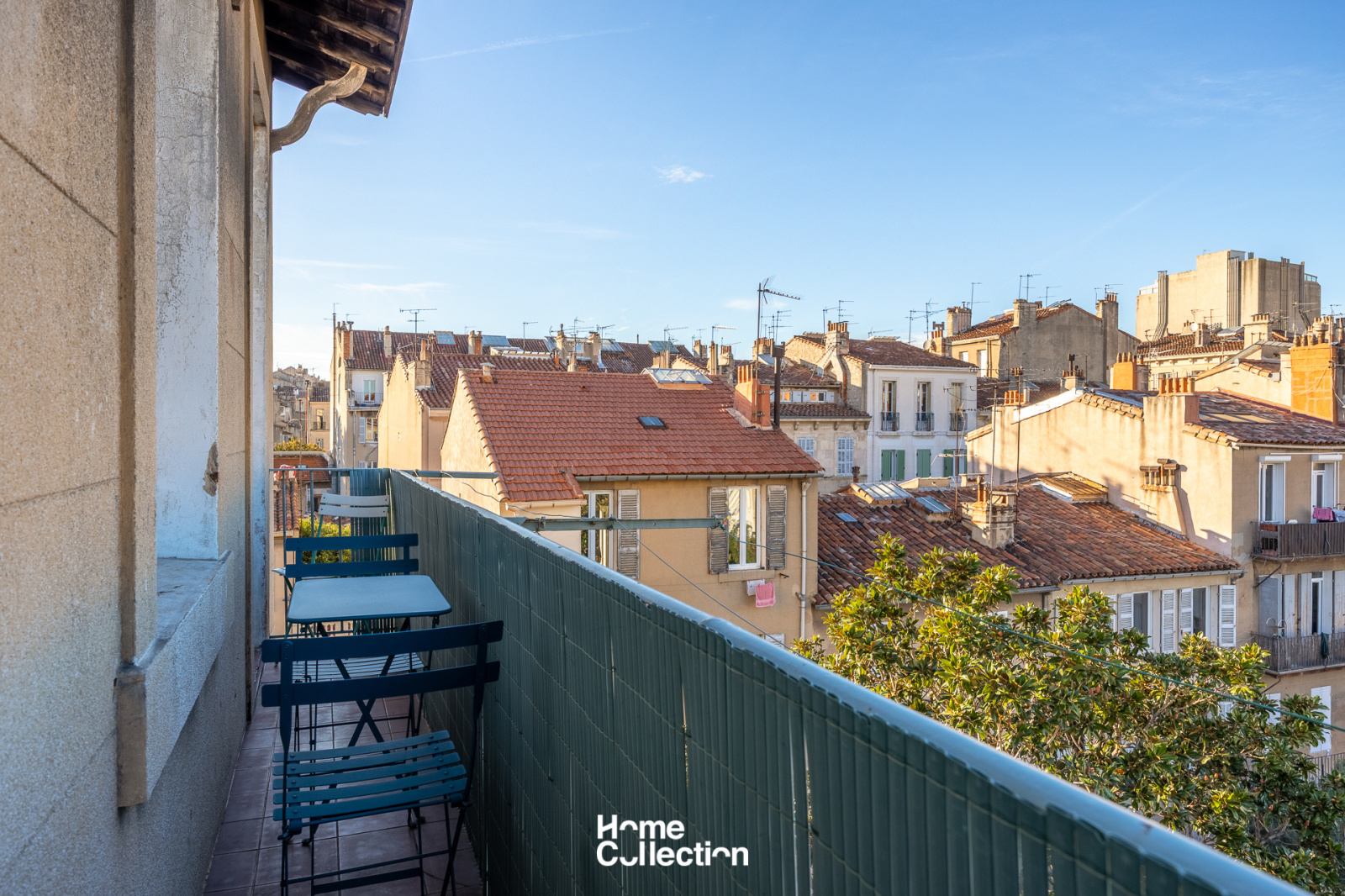L’entrée s’ouvre sur une pièce de vie spacieuse avec cuisine ouverte, donnant accès à un balcon de 3,8 m2. Celui-ci se prolonge jusqu’à la chambre et offre une vue dégagée sur les toits marseillais, avec la possibilité d’installer une petite table pour profiter pleinement d’un extérieur à ciel ouvert.