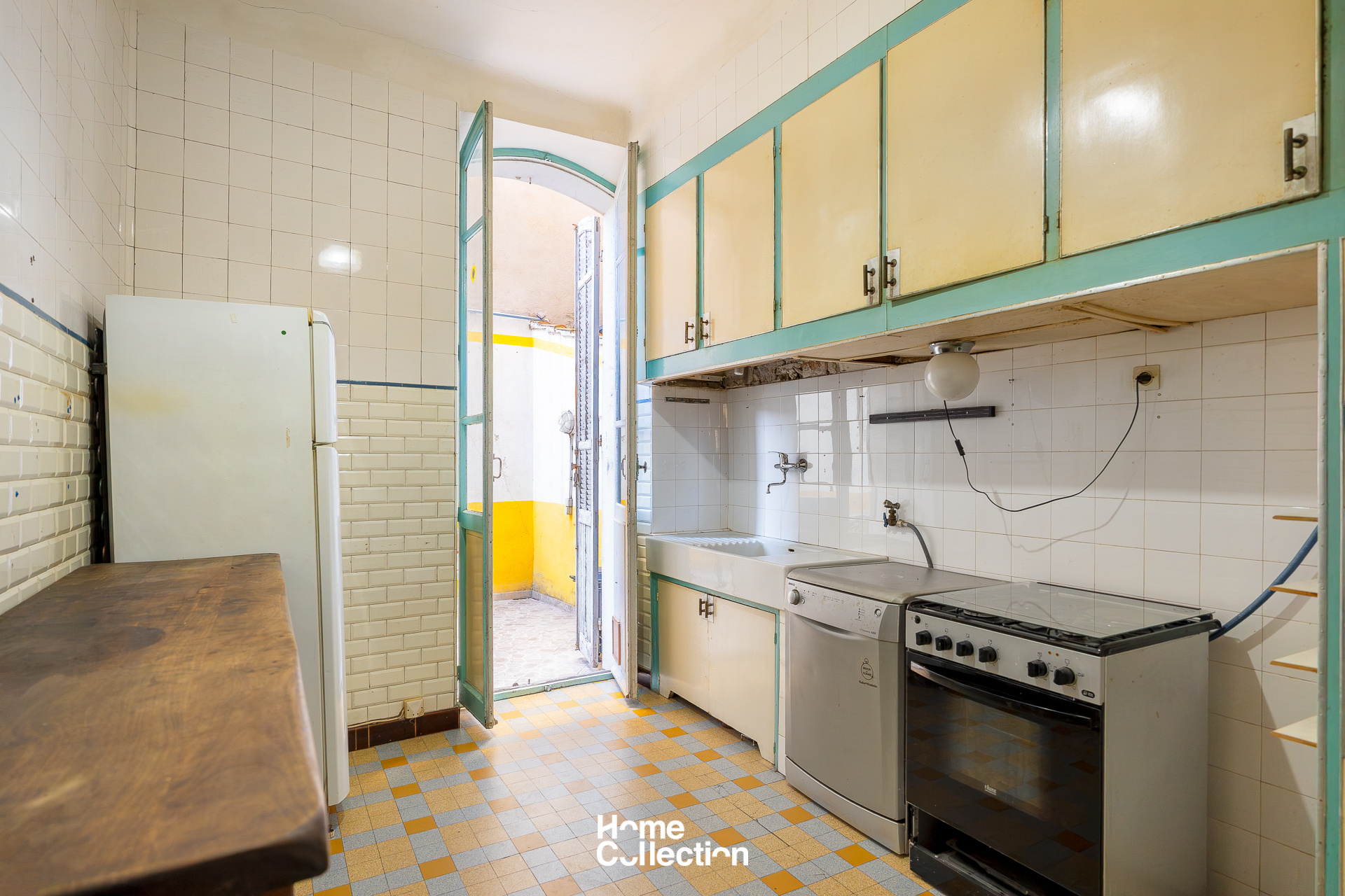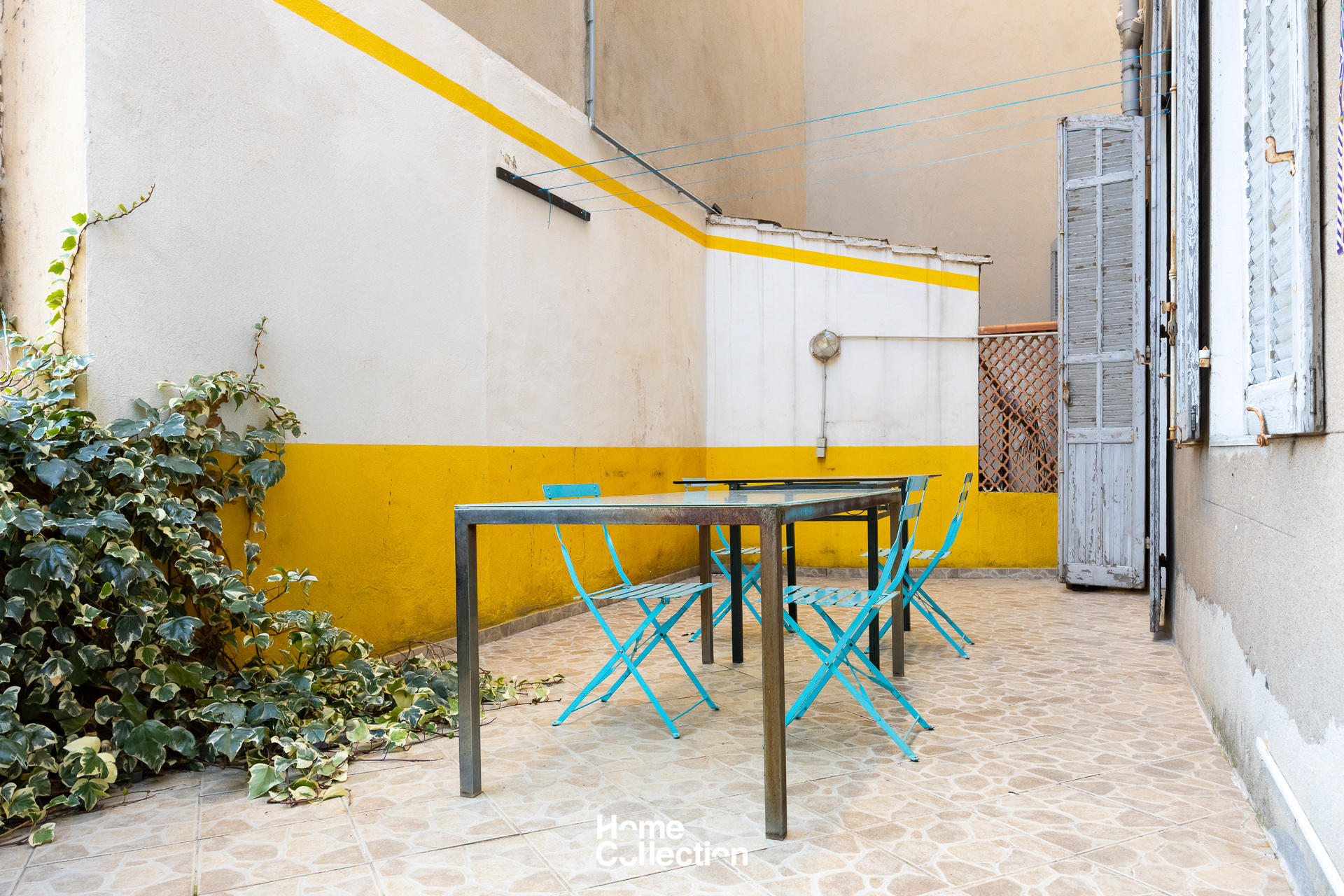 Dès l’entrée, laissez-vous surprendre par les volumes généreux et les sols effet granito aux inspirations Art déco. Le hall distribue un vaste séjour, deux chambres, puis une cuisine s’ouvrant sur une terrasse de 25 m², tournée vers une cour intérieure à l’esprit de village, où se mêlent plantes et façades colorées typiquement marseillaises.