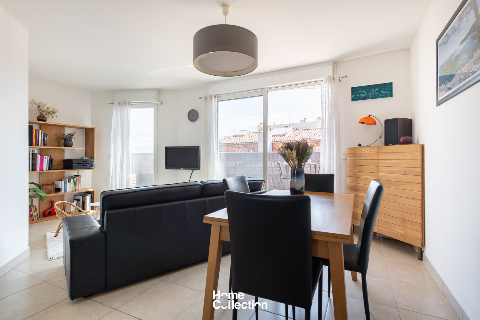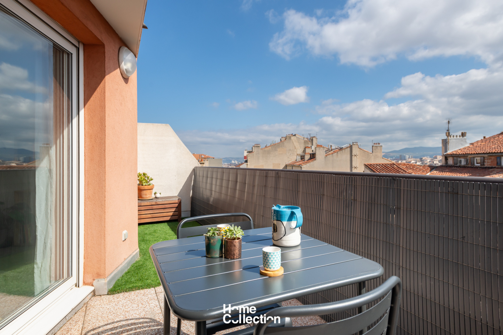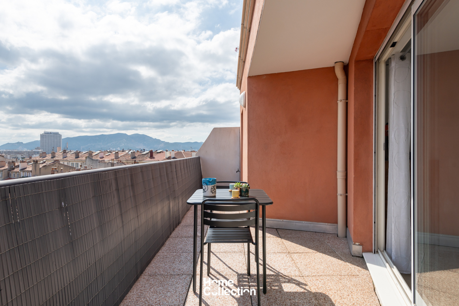 Le coin jour est composé d'un séjour/cuisine en angle, lequel ouvre sur la terrasse plein ciel de 15m2 avec vue sur les toits de Marseille.