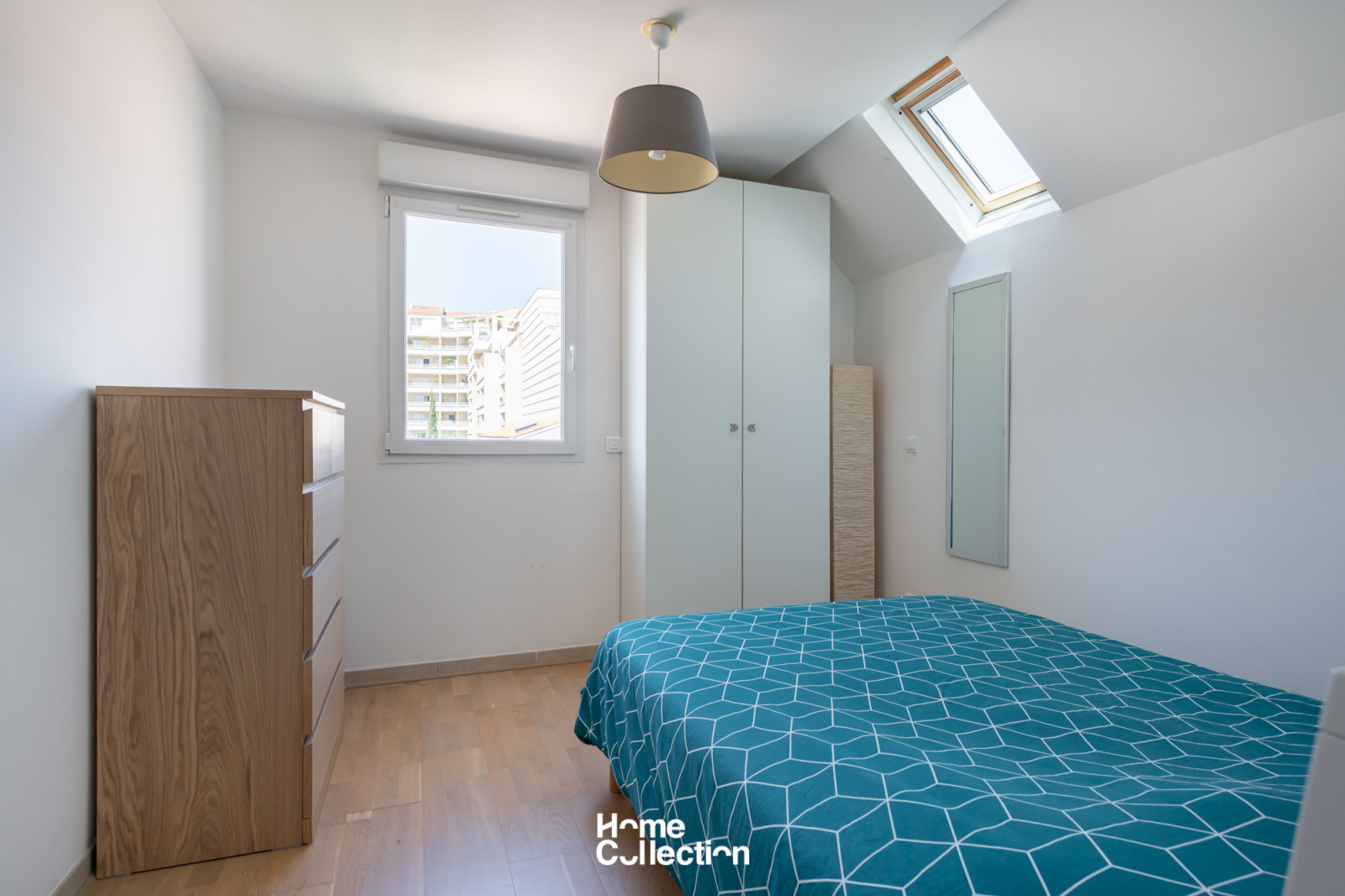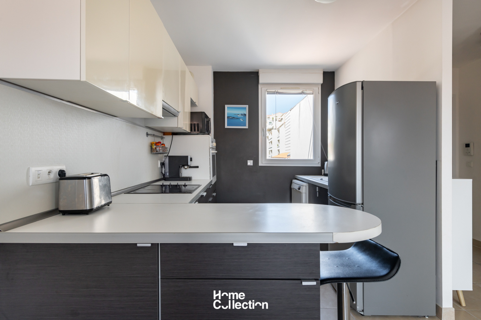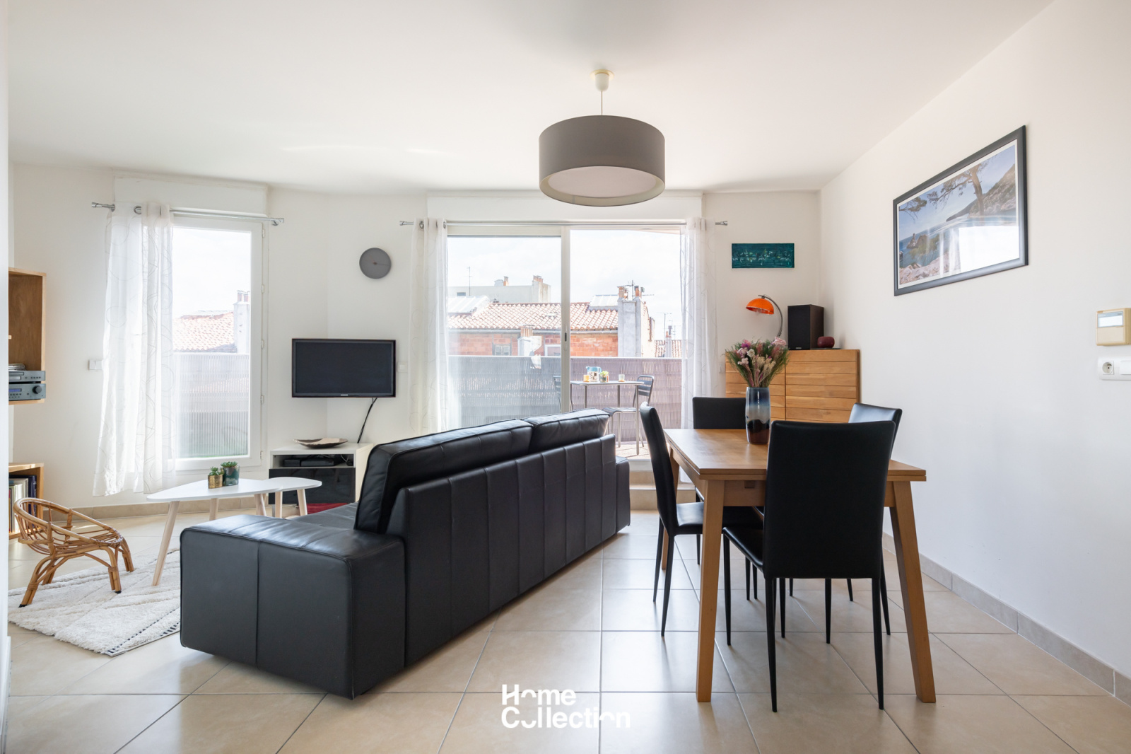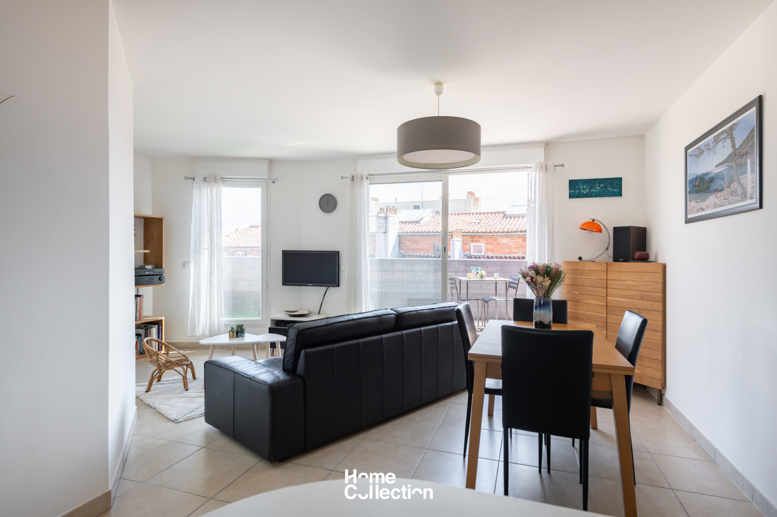 Le coin jour est composé d'un séjour/cuisine en angle, lequel ouvre sur la terrasse plein ciel de 15m2 avec vue sur les toits de Marseille.