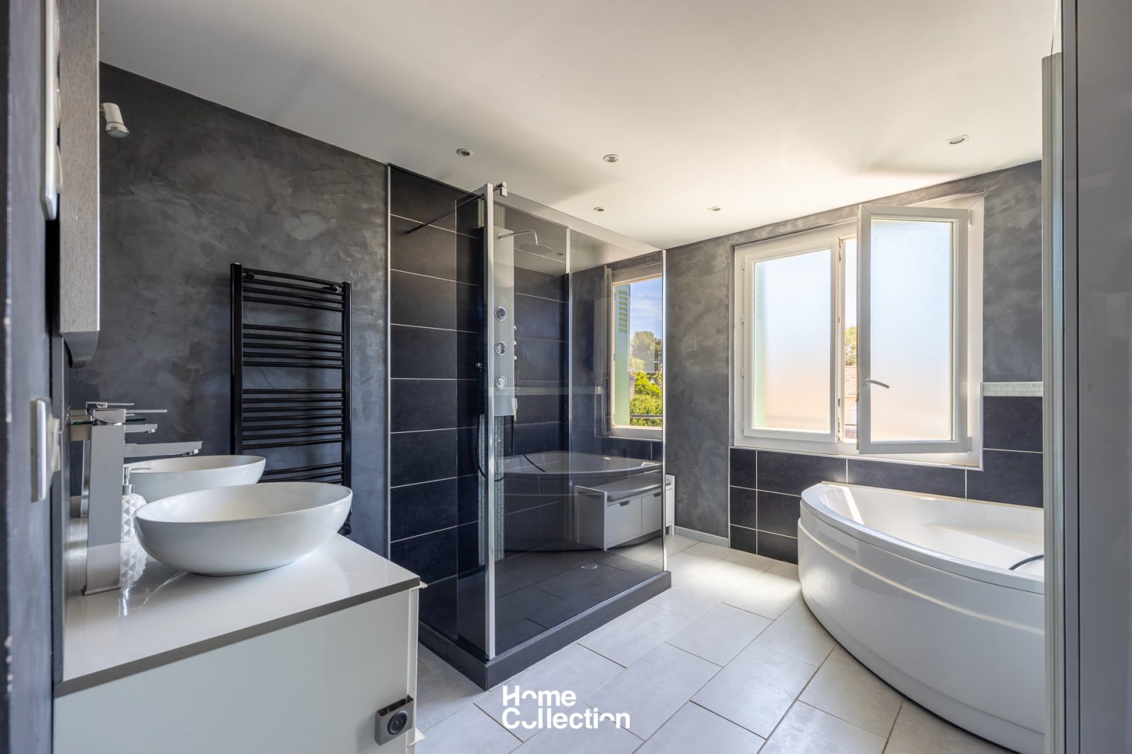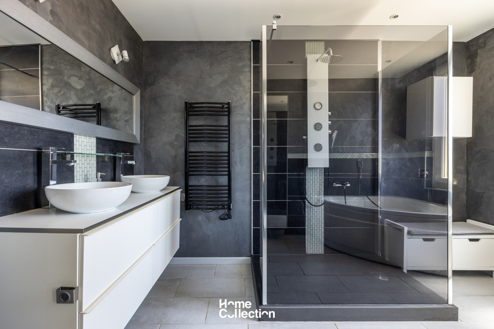 Le coin nuit dessert deux chambres dont une avec son grand dressing. Une salle de bain élégante avec sa baignoire d’angle, douche à l’italienne et double vasques. Une chambre se situe à l’entrée, exposé plein sud pouvant faire office également de bureau, salle de jeux ou chambre d’amis.