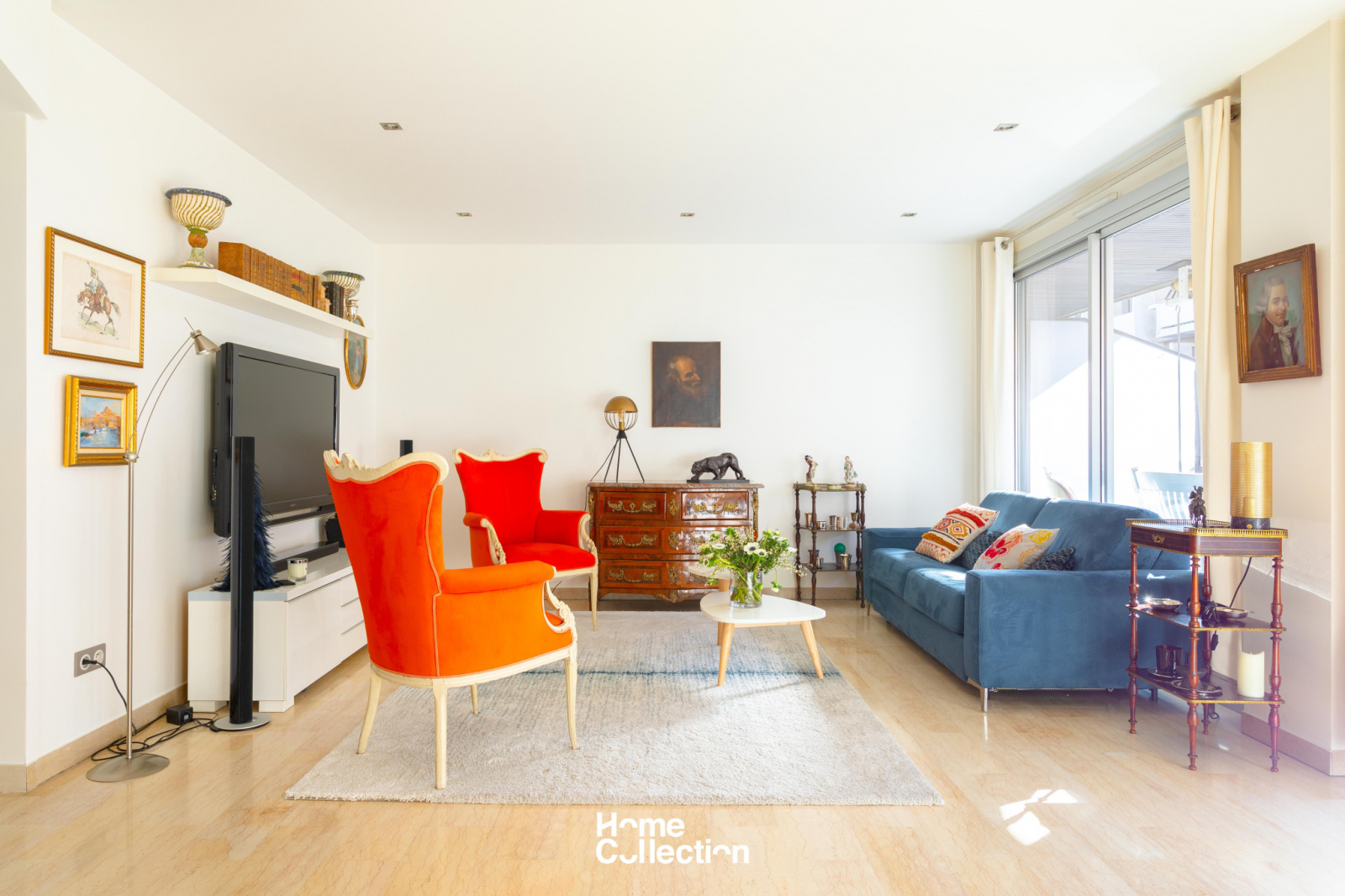 L'appartement se dévoile à travers une belle entrée de 9m2 faisant office de bureau, qui ouvre sur un magnifique séjour / salle à manger (40m2) baigné de lumière grâce à ses trois larges baies vitrées exposées sud-ouest. Une cuisine indépendante complètement aménagée et équipée avec un très beau plan de travail en pierre complète l'espace jour.